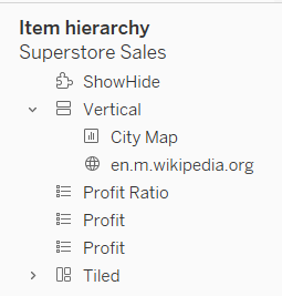 properties. You can find and change the names of the zones in the dashboard using the Layout pane in Tableau, under Item Hierarchy. You want to make sure that the zones you want to show and hide are floating.